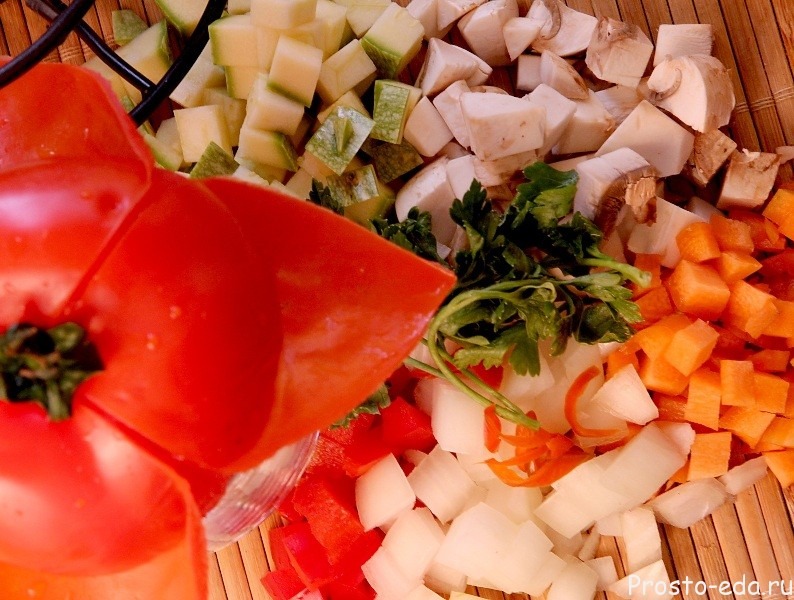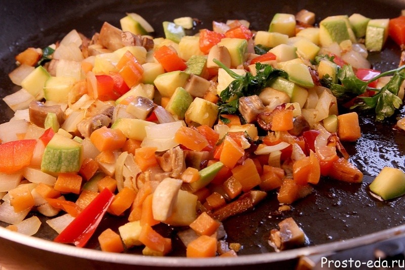 Затем срежем шляпку у помидора и вынем всю массу изнутри с помощью чайной ложки. Будьте осторожны, не повредите и не проткните помидор. Итак, пустышка готова, теперь приготовим начинку. На сковороде с растительным маслом обжариваем мелкие кубики лука, цукини, грибов, красного перца, и мелко рубленный чеснок. Солим, перчим и через 1 минуту снимаем с огня.