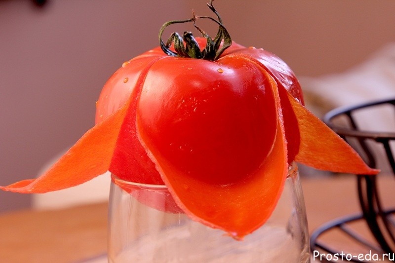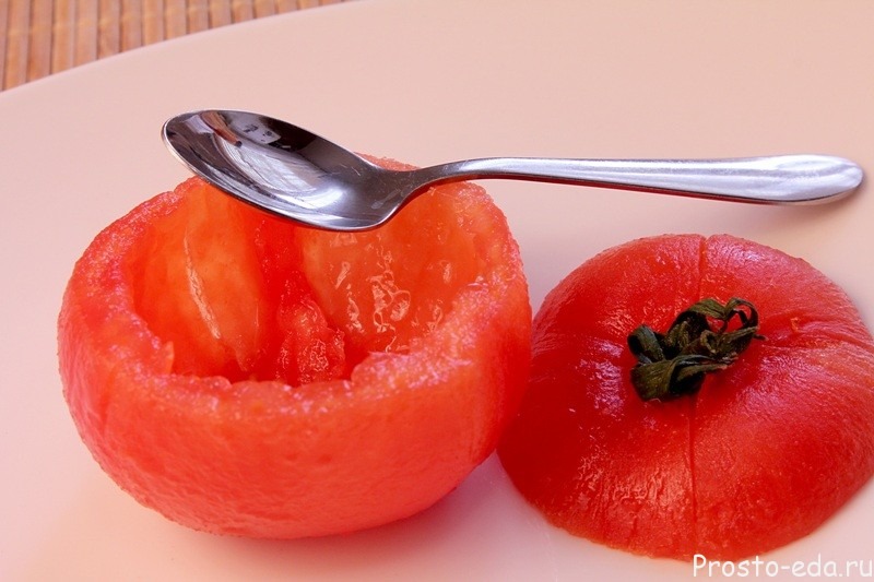 Надрежьте кожицу помидора. В кипящую воду опустите помидор на 30-40 секунд, потом слейте воду и залейте холодной. Кожица начнет заворачиваться, нам останется ее полностью снять.